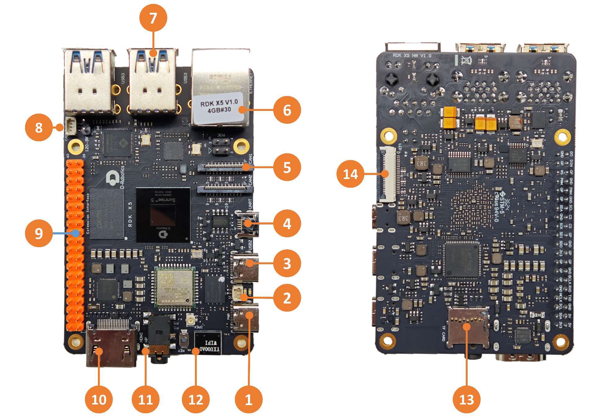 RDK-X5 是面向机器视觉与机器人应用的开发板,提供丰富的外设接口以满足摄像头、传感器、显示与通信等场景的开发需求。本文档整理了常用的硬件接口与基础操作方法,便于快速上手与调试。